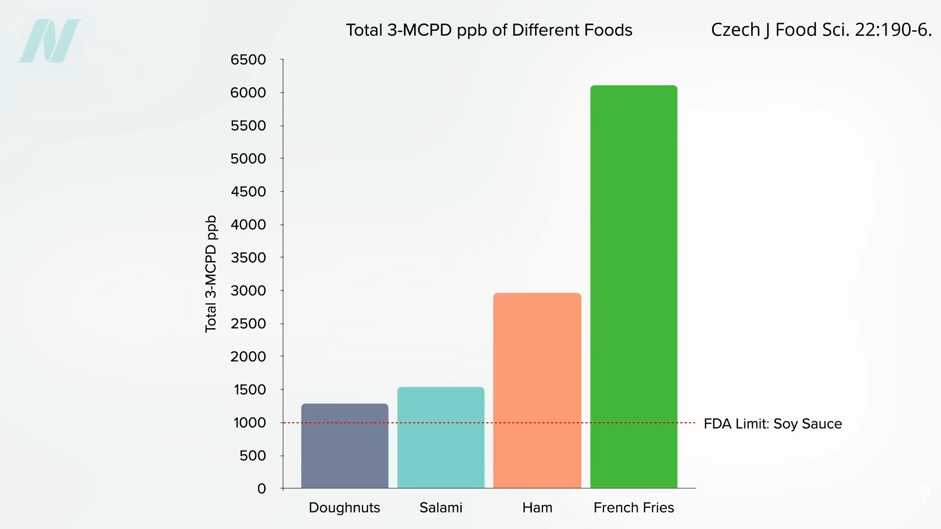 The U.S. Food and Drug Administration’s limit for soy sauce is 1,000 ppb, but donuts can have more than 1,200 ppb, salami more than 1,500 ppb, ham nearly 3,000 ppb, and French fries in excess of 6,000 ppb, as seen here and at 4:03 in my video The Side Effects of 3-MCPD in Bragg’s Liquid Aminos.