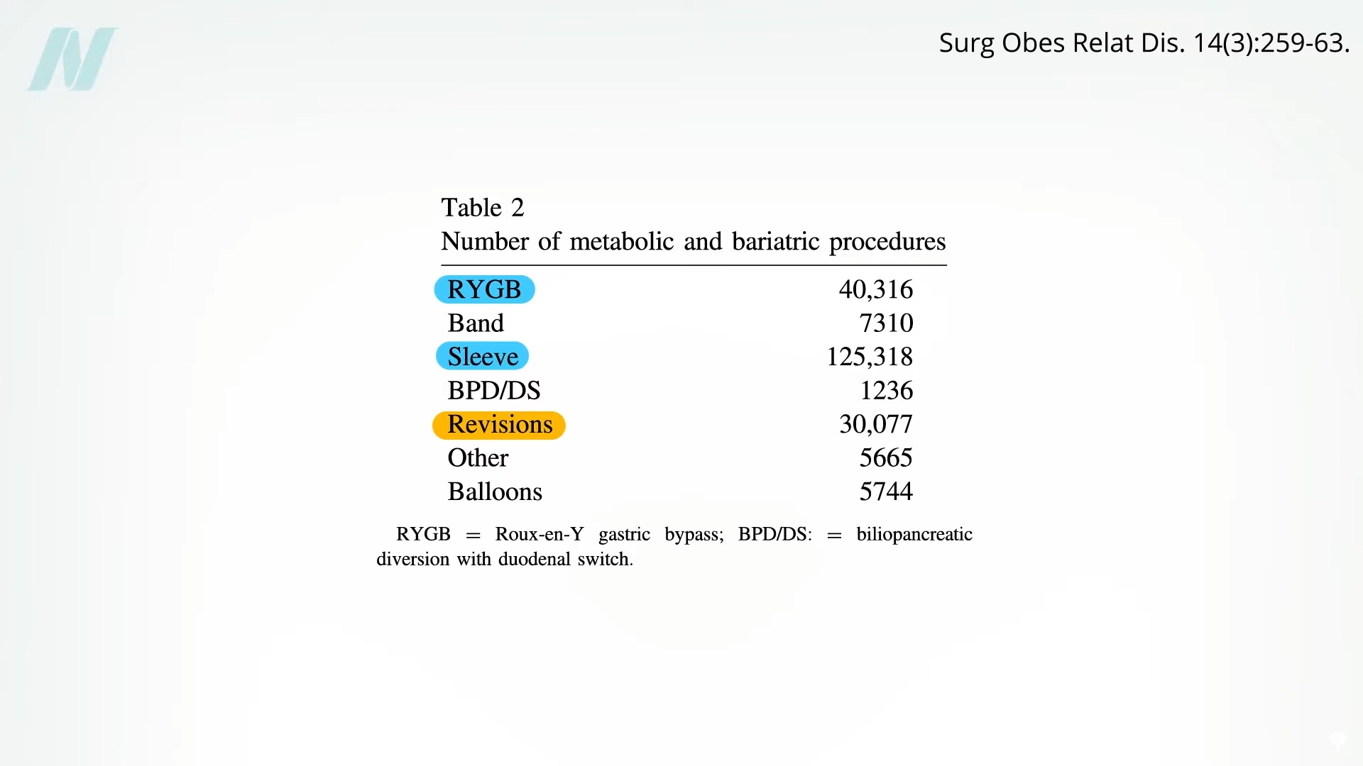 After sleeve gastrectomy and Roux-en-Y gastric bypass, the third most common bariatric procedure is a revision to fix a previous bariatric procedure, as you can see below and at 0:16 in my video The Complications of Bariatric Weight-Loss Surgery.